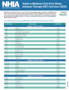 Medicare’s fee-for-service program (Parts A, B and D) is the only major health plan in the country that does not offer comprehensive coverage for most infusions done in a patient’s home. Medicare coverage for home infusion is fractured across multiple contractors and benefits, each with its own rules and billing pathways. Although NHIA’s home infusion drug list includes more than 300 drugs, the Medicare DMEPOS benefit covers just over 35 DMEinfused drugs, a limited number of PN ingredients, and IVIG products—less than a quarter of the full list. With narrow coverage and very specific requirements, understanding Medicare’s policies is essential for accurate billing and successful reimbursement. Use this page to access quick code references, coverage guidance, and tools that simplify the Medicare billing process.