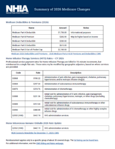 Quick reference to the most important Medicare payment and pricing changes taking effect in 2026, including updated Medicare deductibles and premiums, current Home Infusion Therapy Services (HITS) professional payment rates (including initial visit and IVIG services), and a summary of the drugs selected for Medicare’s 2026 Drug Price Negotiation Program.